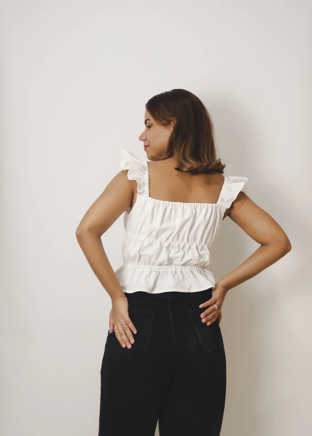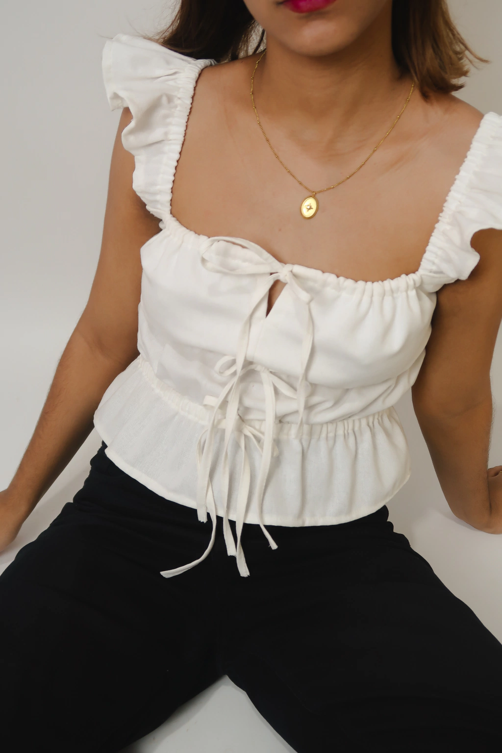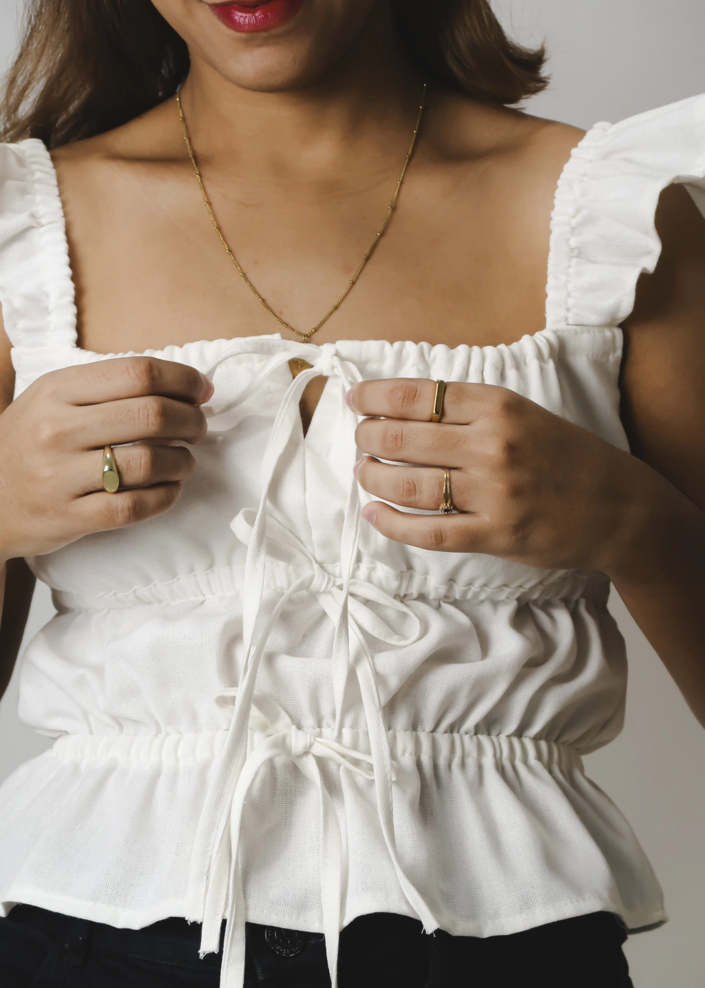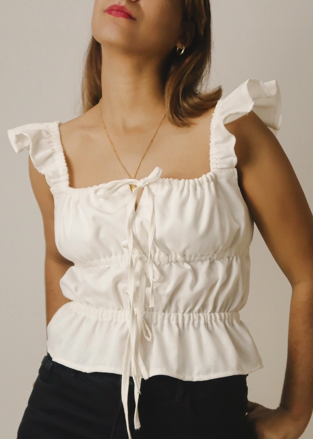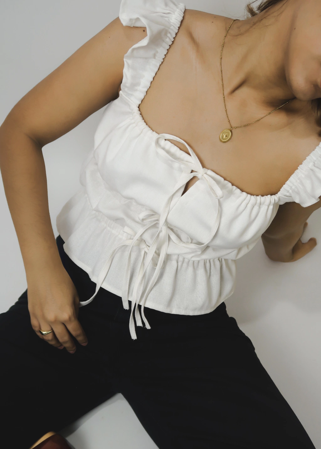 Blusa delicada, com detalhes em elástico e amarrações, possui ajuste e dupla camada de tecido no busto para maior conforto.